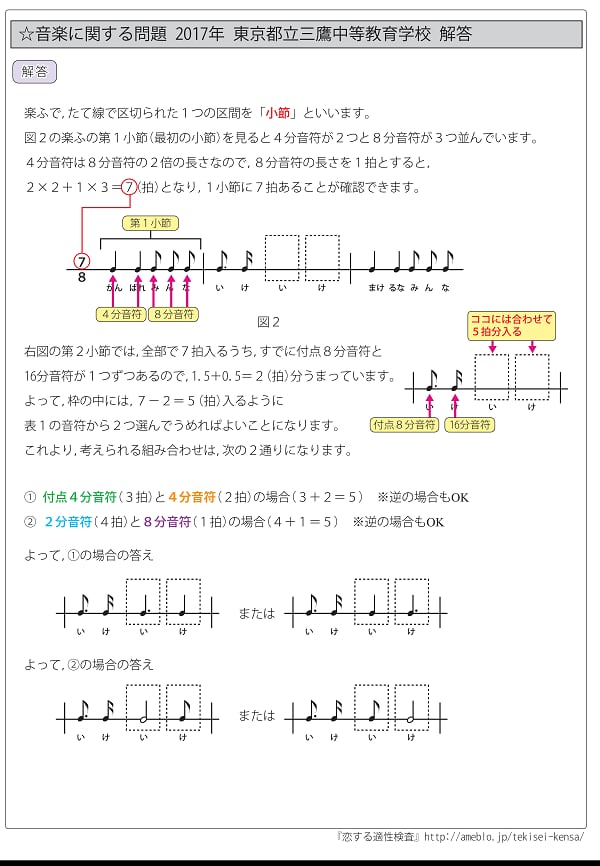 公立中高一貫校の適性検査では、科目横断型の問題が出題され、算数と音楽を融合した問題もよく出題されています。